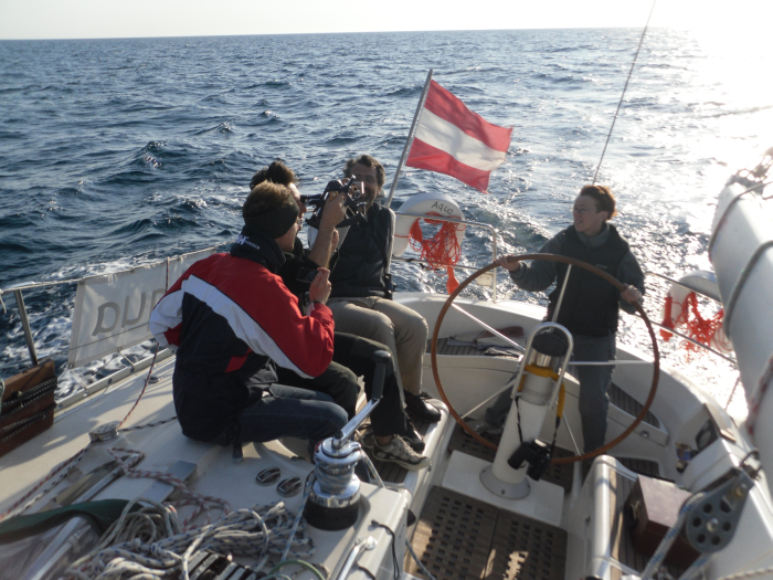 So legte die Crew dann auch am Freitag Abend gegen 2200 ab und navigierte unter Motor bei glatter See und keinem Wind zwischen den Verkehrstrennungsgebieten durch. Kurs: Tremiti, im Hinterkopf schon eine Steckenverkürzung suchend, um die Nerven vor langem Motorgeräuschen zu verschonen. Denn Erwartungen zum Trotz begann gegen Samstag Mittag eine Maestrale mit bis zu drei Beaufort zu wehen. Diese Gelegenheit wurde ohne zu zögern am Schopf gepackt und der Spinnaker gesetzt. Die Windrichtung selbst war aber für schnelles Vorankommen nicht geeignet, darum wurde der Spinnaker vorgerichtet und mit Kursen „spitze Raume“ vor dem Wind gekreuzt. So segelte die Aqua mit sechs bis sieben Knoten zwischen den Bohrinseln durch, als Halsemarken wurden die äußeren Grenzen der Verkehrstrennungsgebiete genommen. Bis zum Abend wurde so zwar nicht viel Weg Richtung Süden, aber trotzdem viele Meilen gemacht. Gegen 1800 schlief der Wind ein und es wurde bei wenig Dünung und untergehender Sonne in Richtung Süden motort.